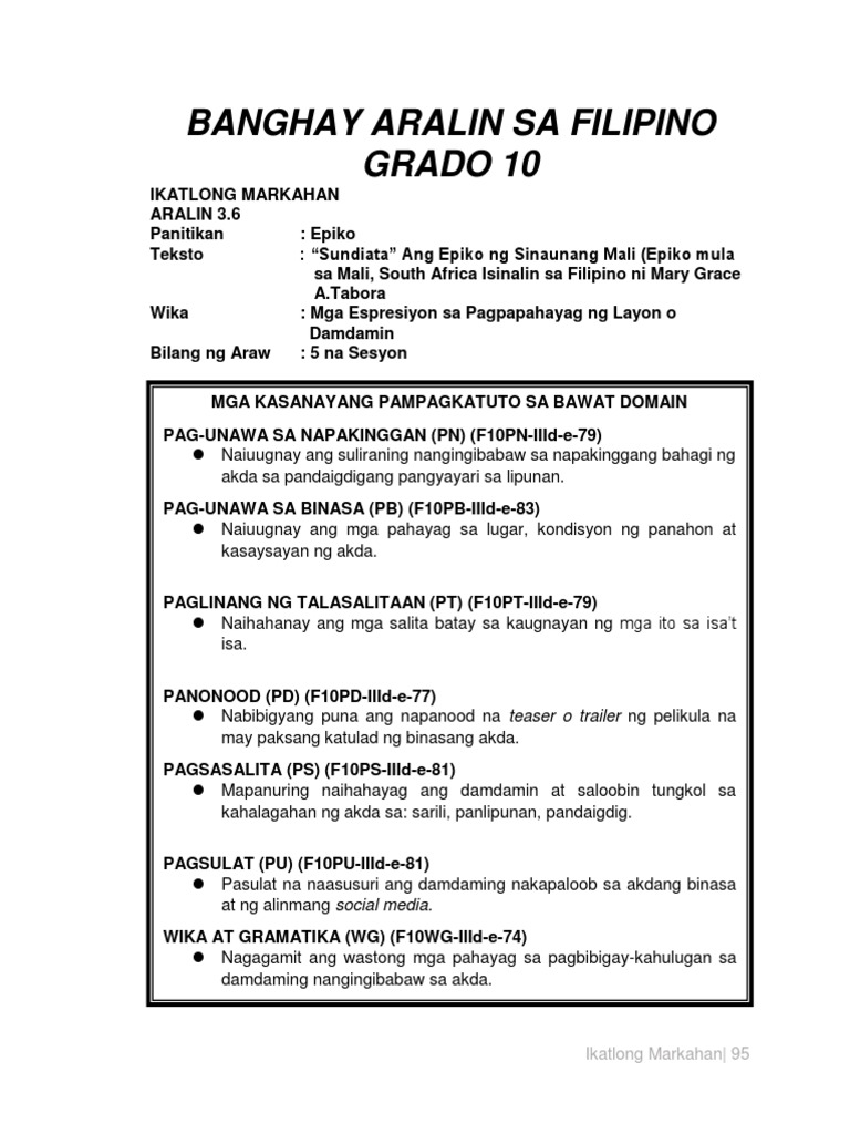 May pagkaka-agwat-agwat na dumating sa sinaunang Pilipinas ang mga Negrito mga Indones at mga Malay. Naiuugnay ang suliraning nangingibabaw sa akda sa pandaigdigang pangyayari sa lipunan F10PN-IIId-e-79 5. Sa edad na pito hindi pa rin siya makakalakad dahil sa pagiging pilay.