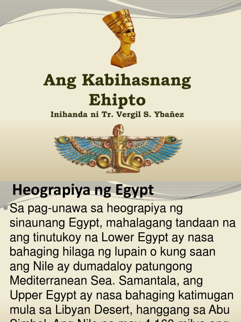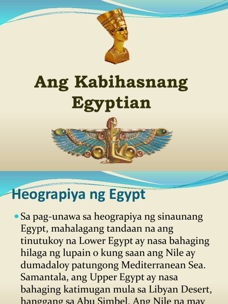Ang Sinaunang Ehipto Matandang Ehipto o Lumang Ehipto ay isang matandang kabihasnan sa silangang Hilagang Aprika na matatagpuan sa mababang bahagi ng Ilog Nilo na kung saan naroon ang kasalukuyang bansa na EhiptoNagsimula ang kabihasnan noong 3150 BC kasama ang pampolitika na pagsasama ng Mataas at Mababang Ehipto sa ilalim ng unang paraon at. Sakop nito ang malaking bahagi ng hilagang-kanluran ng dating India at ang kinaroroonan ng lupaing Pakistan sa kasalukuyan. KABIHASNAN SA EGYPT Ang mga Sinaunang Kabihasnan Natatanging lokasyon ang Egypt dahil napapalibutan ito ng disyertoNakasentro ang kanilang kabuhayan sa pagsasakaRegular na umaapaw ang nile river na nagsisislbing patubig at nagdadala ng silt na pampataba ng kanilang pananim.