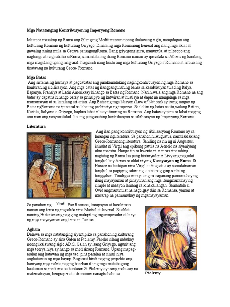 Imperium Romanum ang tawag sa imperyalistang paghahari ng mga Romano sa malaking bahagi ng Europa Asya at Hilagang Aprika na may autokratikong porma ng pamahalaan. Contextual translation of mga ambag ng romano into English. Human translations with examples.