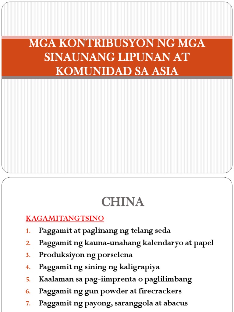 Alin sa mga kontribusyon ng sinaunang lipunan at komunidad sa Asya ang naisasabuhay mo pa rin at nagagamit hanggang ngayon. MGA KONTRIBUSYON NG MGA.